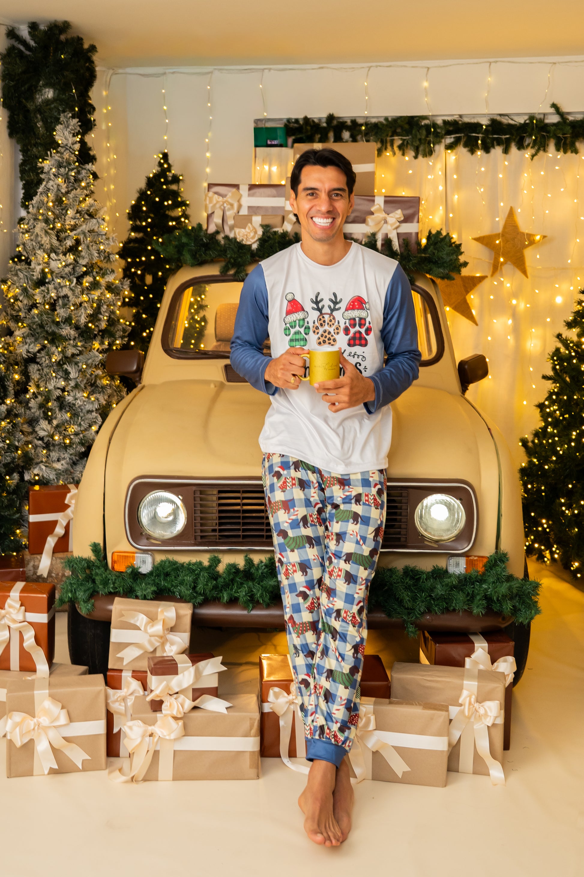 Incluye una camiseta blanca con mangas azules con estampado de huellitas, acompañada de un pantalón largo de cuadros con estampado de perritos navideños. Una prenda cómoda, fresca y con mucho estilo para la temporada decembrina.
