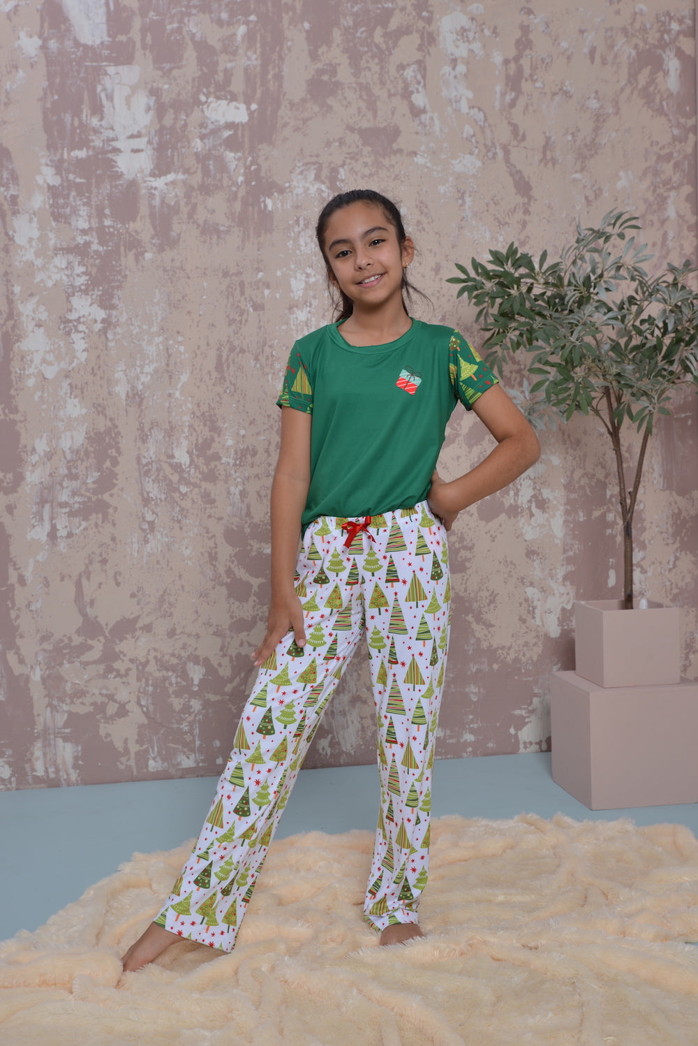Incluye una camiseta verde de mangas cortas con estampado de regalo, acompañada de un pantalón blanco con estampado de arbolitos de navidad. Una prenda cómoda, fresca y con mucho estilo para la temporada decembrina.