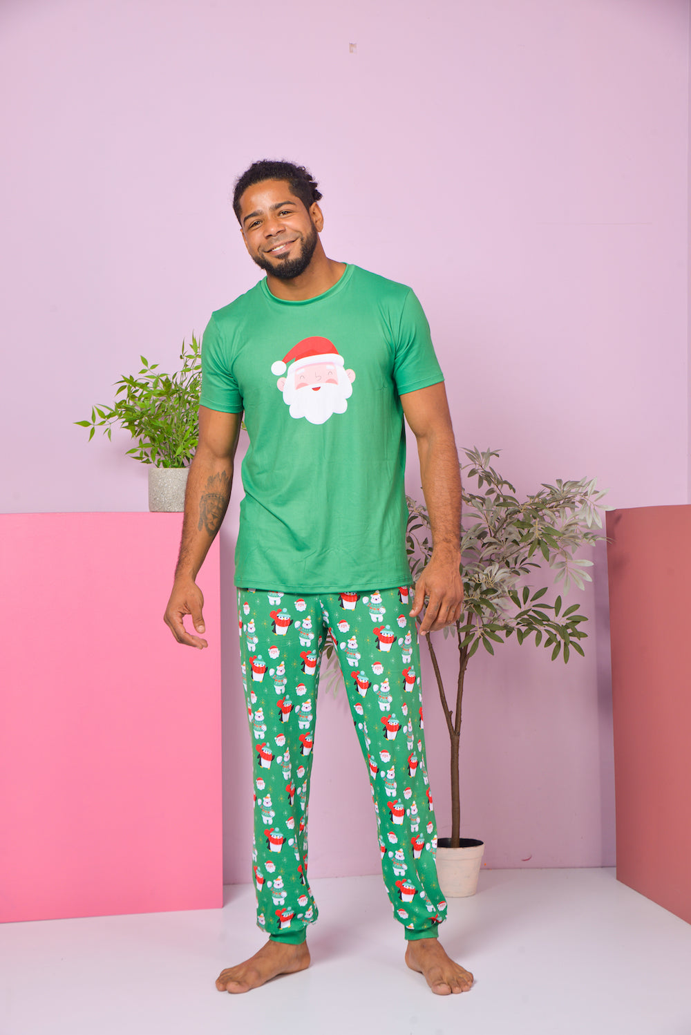 Incluye una camiseta verde de manga corta con estampado de cara papá noel, acompañada de un pantalón largo verde con estampado de muñecos de nieve. Una prenda cómoda, fresca y con mucho estilo para la temporada decembrina.