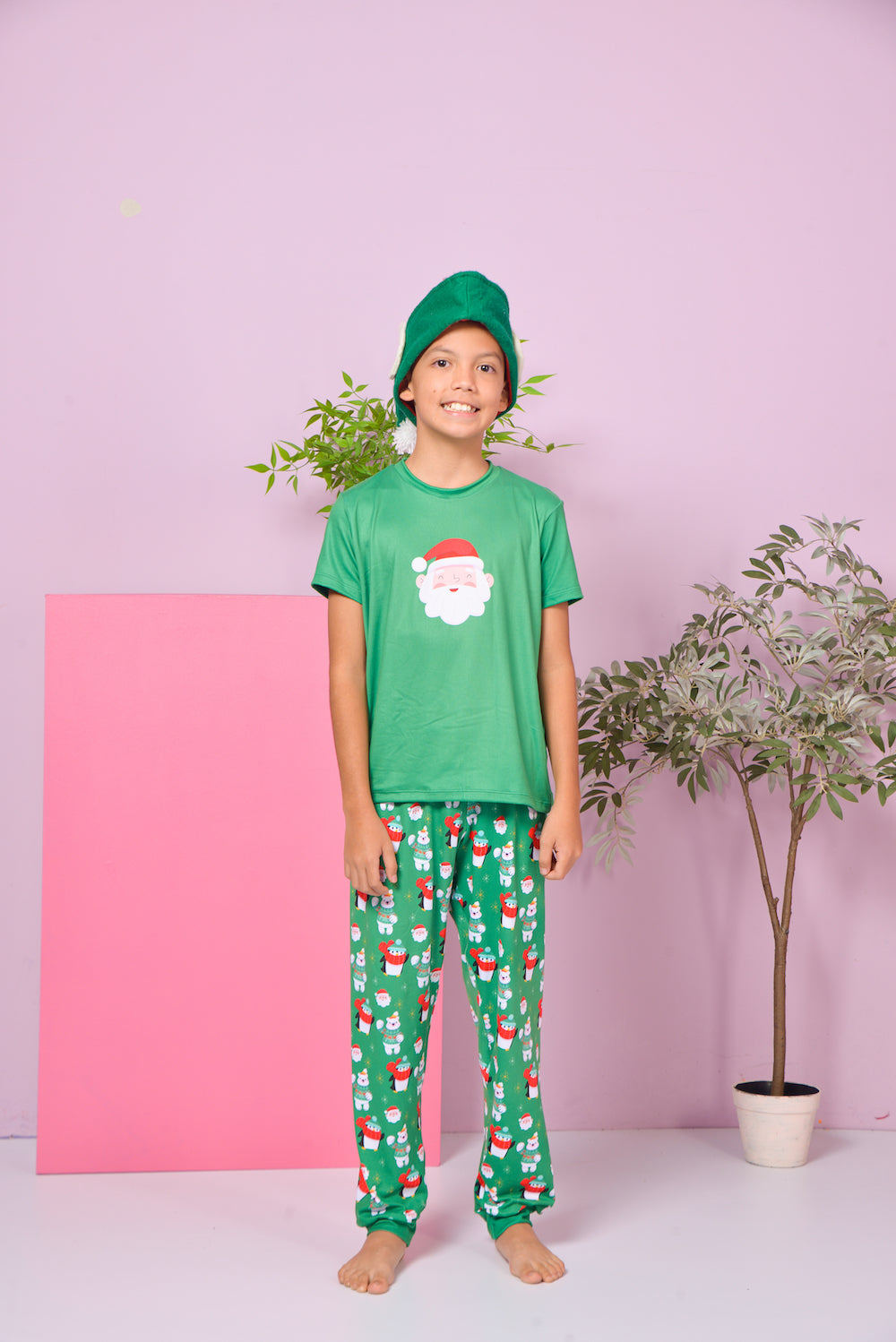 Incluye una camiseta verde de manga corta con estampado de cara papá noel, acompañada de un pantalón largo verde con estampado de muñecos de nieve. Una prenda cómoda, fresca y con mucho estilo para la temporada decembrina.