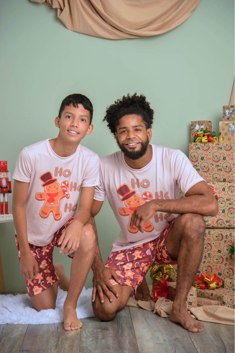 Pantalón capri para niña y pantaloneta para niño y papá color vino con diseño de galletas navideñas