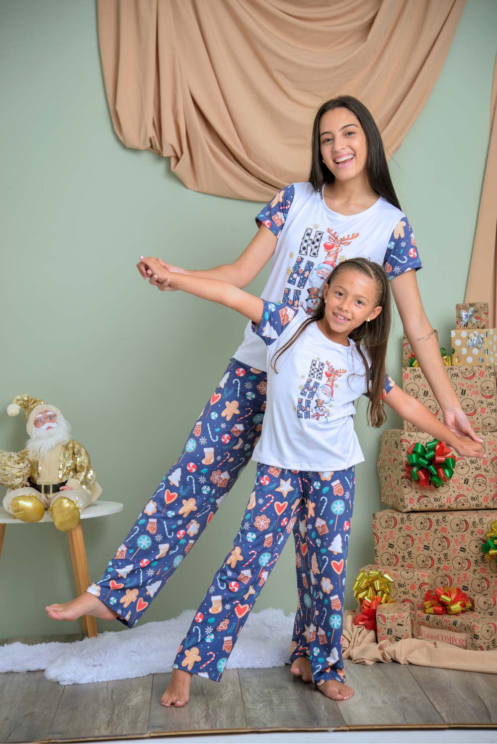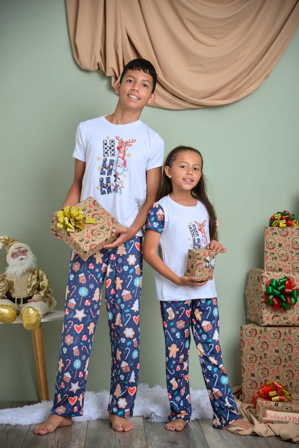El diseño combina camiseta blanca estampada con el divertido “Ho Ho Ho” navideño y pantalón largo en tonos azules con galletas de jengibre, dulces y estrellitas que transmiten toda la alegría de la temporada.