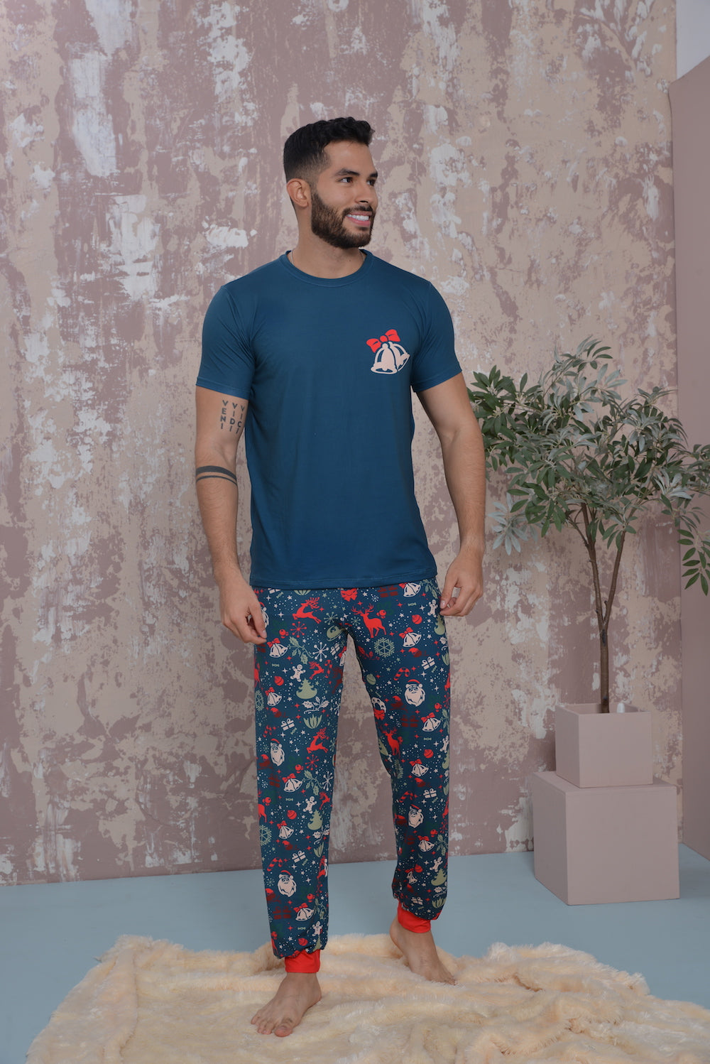 Incluye una camiseta azul petróleo de mangas cortas con estampado de campanas, acompañada de un pantalón azul petroleo con estampado navideño. Una prenda cómoda, fresca y con mucho estilo para la temporada decembrina.