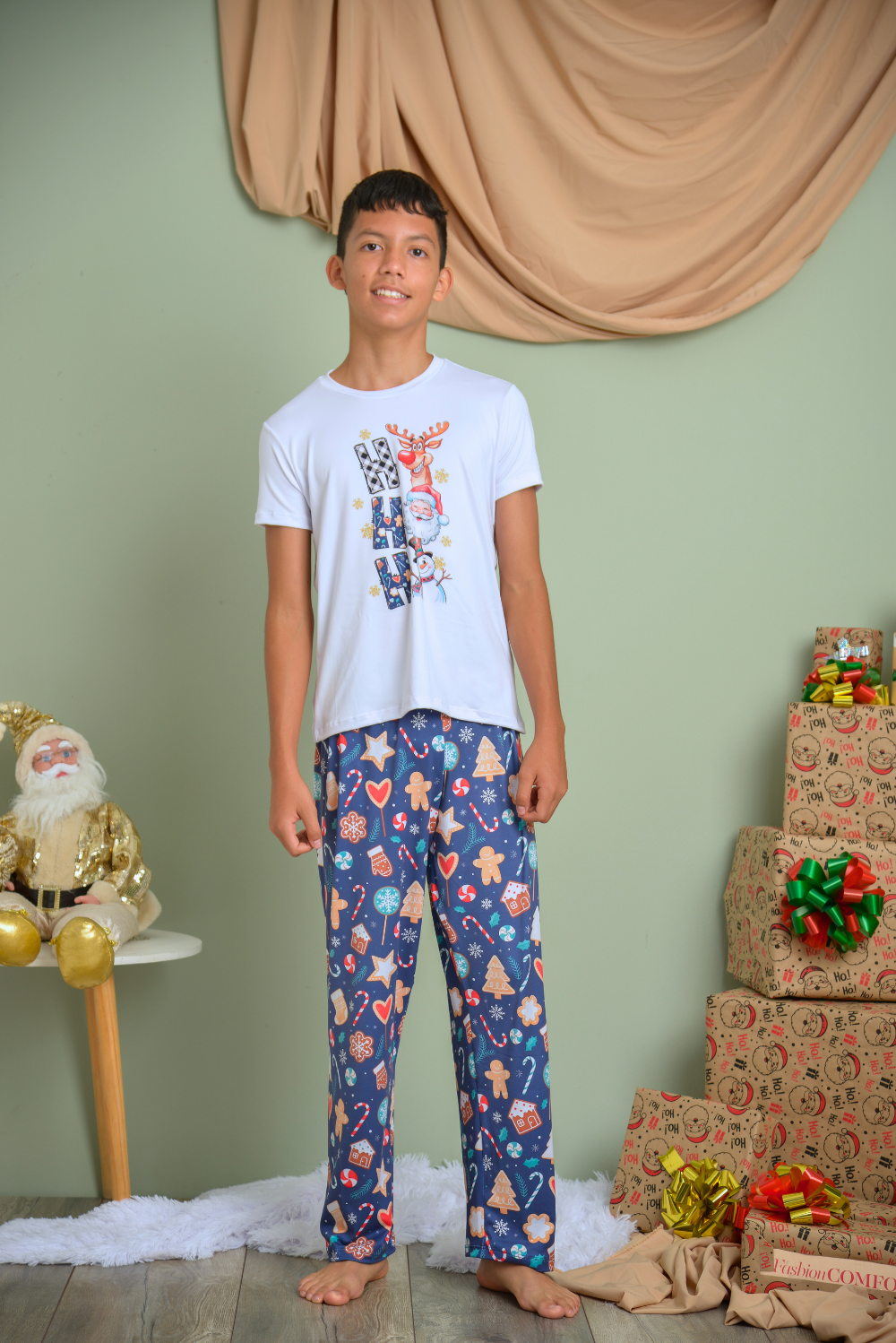 La camiseta blanca luce un estampado alegre con la frase “Ho ho ho” acompañada de un reno, santa y un muñeco de nieve El pantalón largo en color azul destaca con un estampado navideño de copos de nieve, bastones navideños y galletas de jengibre, que evocan la magia de la Navidad.