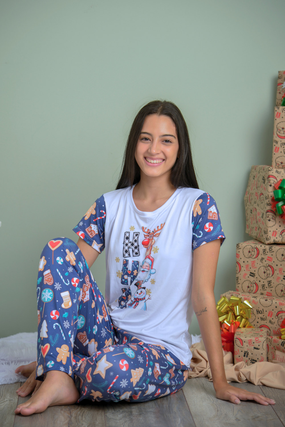 La camiseta blanca luce un estampado alegre con la frase “Ho ho ho” acompañada de un reno, santa y un muñeco de nieve El pantalón largo en color azul destaca con un estampado navideño de copos de nieve, bastones navideños y galletas de jengibre, que evocan la magia de la Navidad.