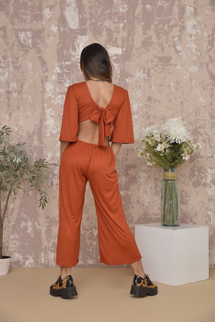 Nuestro jumper está confeccionado en una tela similar a la viscosa elástica, caracterizada por su suavidad, frescura y comodidad al vestir. Su diseño moderno en color terracota resalta la silueta con un escote en V profundo, mangas amplias a media manga y un detalle central con aro que aporta un toque elegante y femenino.