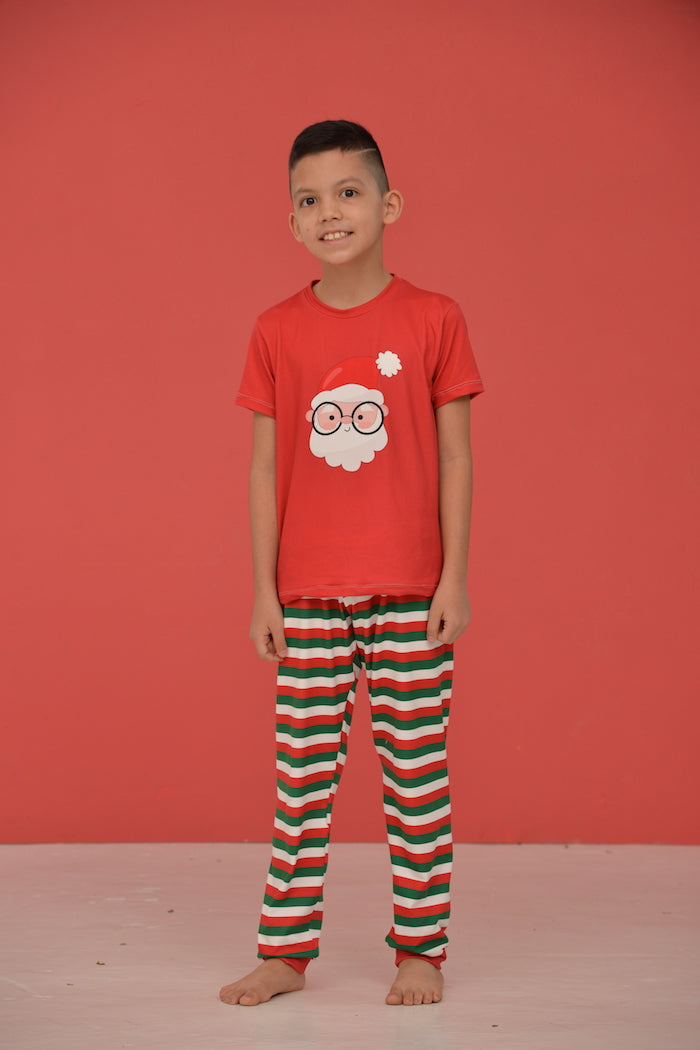 Incluye una camiseta roja de manga corta con estampado de cara papá noel, acompañada de un pantalón largo de lineas rojas, blancas y verdes. Una prenda cómoda, fresca y con mucho estilo para la temporada decembrina.
