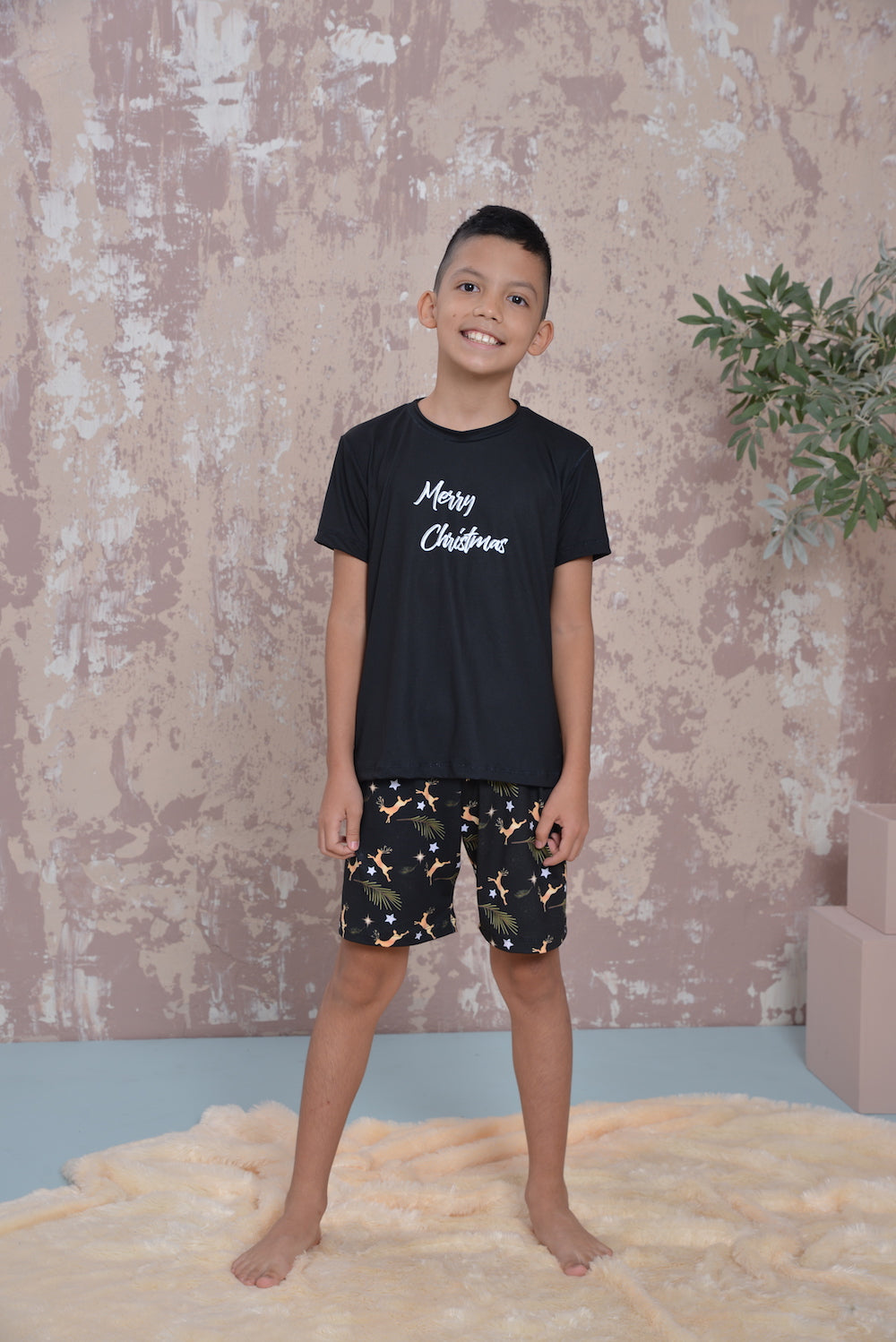 Incluye una camiseta negra de mangas cortas con estampado de Merry christmas, acompañada de un short con estampado de venados. Una prenda cómoda, fresca y con mucho estilo para la temporada decembrina.