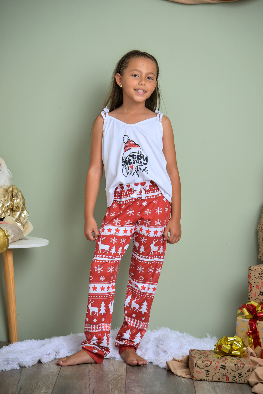El conjunto incluye una blusa de tiras ajustables, decorada con estampado de gorro navideño y la frase “Merry Christmas”, junto a un pantalón largo rojo estilo nórdico, con dibujos de pinos, copos de nieve y renos. Una prenda cómoda, fresca y perfecta para disfrutar la temporada en familia.