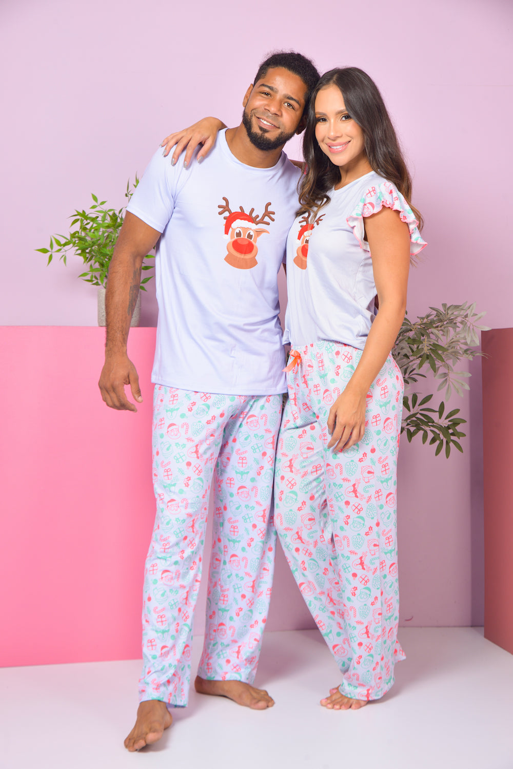 Incluye una camiseta gris claro de manga corta con estampado de reno, acompañada de un pantalón largo en el mismo color de la camisa con estampado de santas,renos y regalos. Una prenda cómoda, fresca y con mucho estilo para la temporada decembrina.